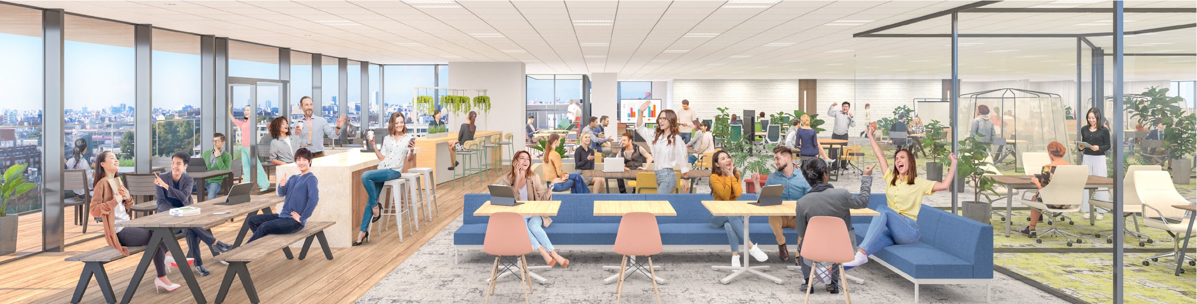 ワンフロア300坪超のゆとりあるワークスペースは、使いやすく自由度の高いオフィスを実現します。水回り設置可能箇所にも配慮。テラスと一体利用できるオフィスキッチンの設置が可能です。また、3ヶ所の専用テラスでは、リフレッシュやミーティングなどのさまざまなシーンで活用いただけます。